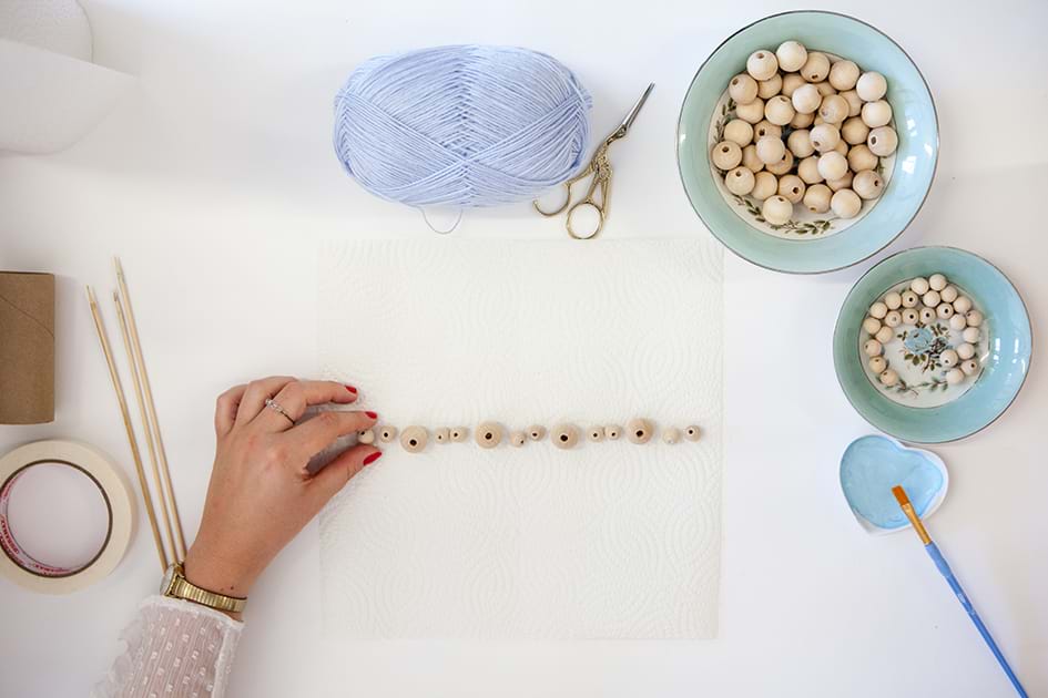 3. Thread the first bead on a skewer and block it off using a piece of tape. Repeat this process with the remaining beads.