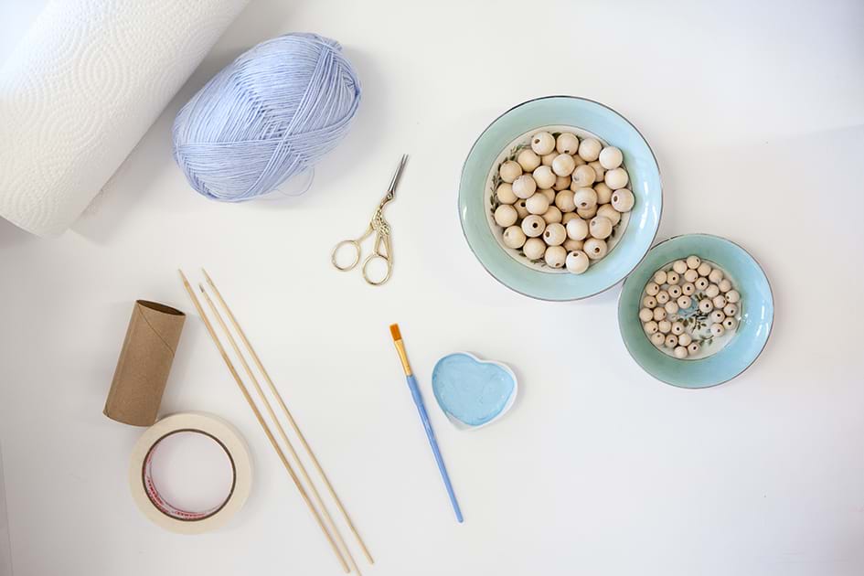 4. Paint the beads and set them aside to dry with the skewer tips leaning on a Cascades Tuff or Cascades Fluff roll.