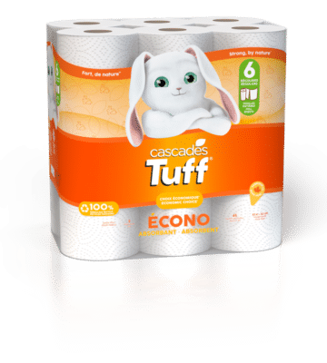 Like all packaging for Cascades Fluff & Tuff® products, the packaging for Cascades Tuff® Econo paper towel is made of 100%-recycled plastic resin.